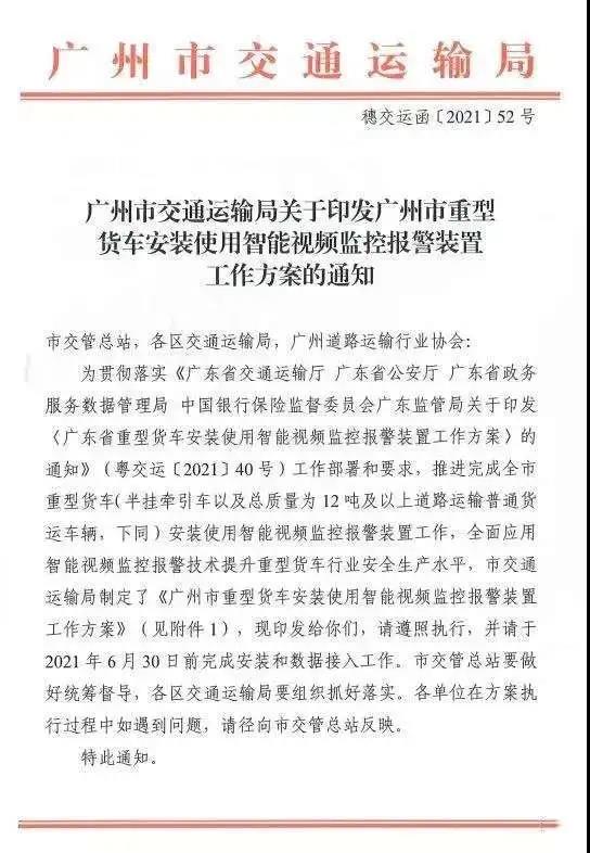 公告指出,办理注册登记业务时,在2021年7月1日(不含)前已销售并开具机动车统一销售发票的第五阶段国家机动车大气污染物排放标准的重型柴油车,可于2021年10月1日(不含)前注册登记。● 3月1日起:粤籍重型货车都要安装视频监控2021年1月27日,广东省交通厅发布了《广东省重型货车安装使用智能视频监控报警装置工作方案》的通知。要求在2021年6月以前,广东省的重型货车要完成视频监控设备的安装工作。