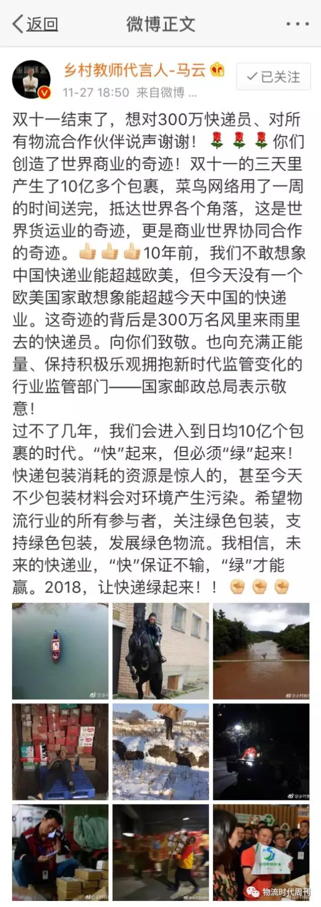 物流好专线一网连中华 “未来的快递业,‘快’保证不输,‘绿’才能赢。2018,让快递绿起来!”马云在微博中说。